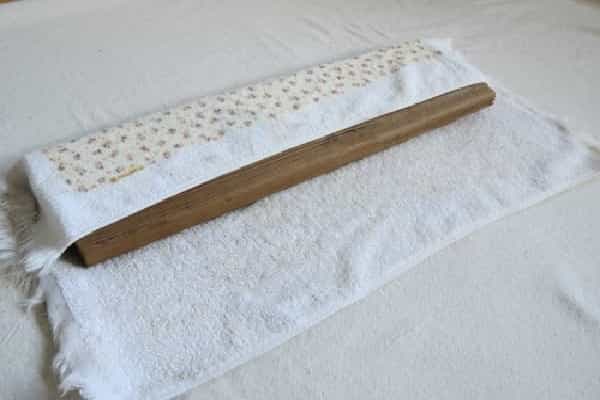 Una vez finalizado, comenzaremos a enrollar la cuerda en el trozo de madera ya forrado con la tela que nos gustó. Para fijarla bien, ocupa corchetes para madera o nuevamente clavos.