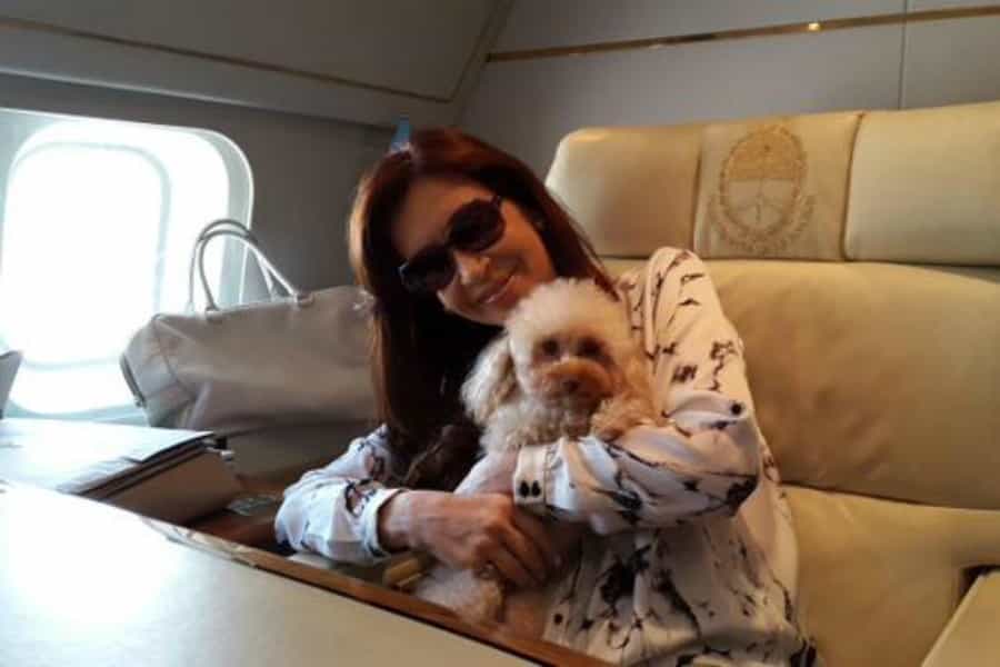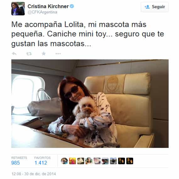 La Presidenta de Argentina, Cristina Fernández de Kirchner, publicó en su cuenta de Twitter una fotografía viajando en avión, en compañía de su mascota "Lolita".