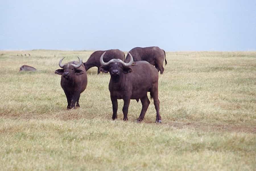 6. Búfalo del Cabo. Es un animal violento e impredecible. Sus enormes cuernos son grandes y desarrollados y pueden atravesar a su víctima de inmediato.