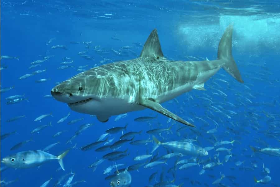 4. Gran tiburón blanco. Con un solo mordisco puede matar a una persona, puesto que abre a tal punto la mandíbula, que esta deforma la cabeza del tiburón abriéndose con una fuerza 300 veces superior a la del humano.