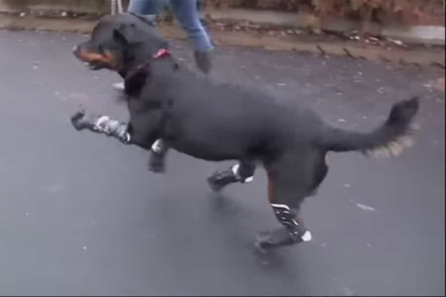 El es Brutus, un perrito que perdió sus patitas cuando apenas era un cachorro, esto fue producto del extremo frío al que se expuso es rottweiler, al que le entregaron una prótesis para que pueda hacer su vida normal.