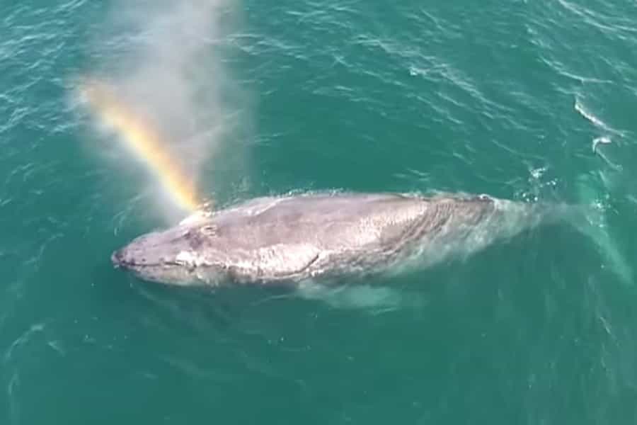 A continuación podrás ver un video que grabado por un dron, en el que se ve una ballena que lanzó aire por su espiráculo y con los rayos del sol que le llegaban al lomo, se pudo ver un arcoiris saliendo del cetáceo.