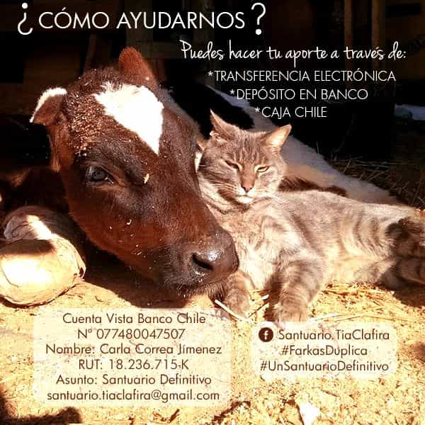 El santuario Tía Clafira hoy alberga a 120 animales de granja rescatados de la muerte para el consumo humano, y además aloja y atiende a 4 ancianos en condiciones de vulnerabilidad. En la desesperación por encontrar otro lugar igual de extenso para continuar con su loable obra, los chicos del santuario encontraron un terreno a la venta cerca de Olmué, el cual cuesta 34 millones de pesos. Este terreno es ideal pues tiene un riachuelo, pequeños cerros y árboles, pero no cuentan con el dinero necesario para comprarlo. Han realizado un desesperado llamado a la gente a colaborar a través de un evento de Facebook donde indican una cuenta bancaria para reunir el dinero, hasta que la noticia llegó a oídos del famoso filántropo Leonardo Farkas, quien una vez más quiso cooperar con los animales, ofreciendo doblar la cifra que se reuniese durante un período de tiempo estimado (hoy, sólo quedan 5 días para reunir la cantidad total).