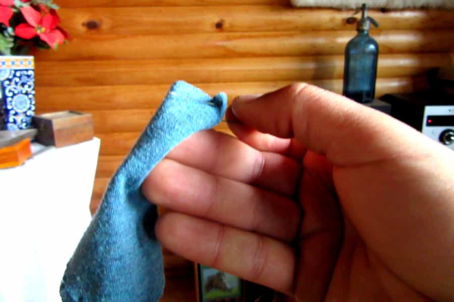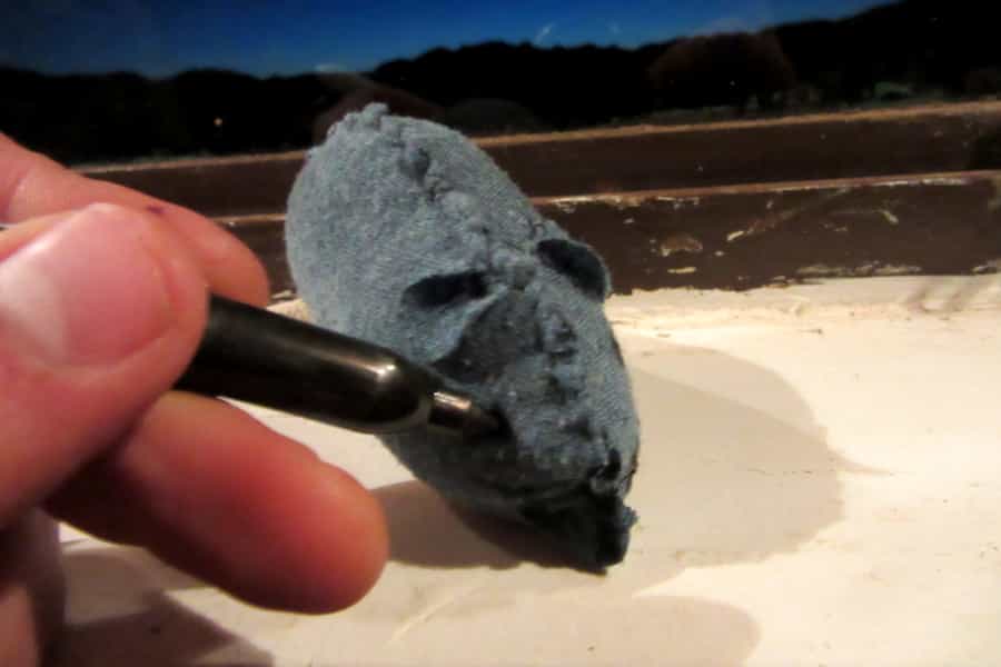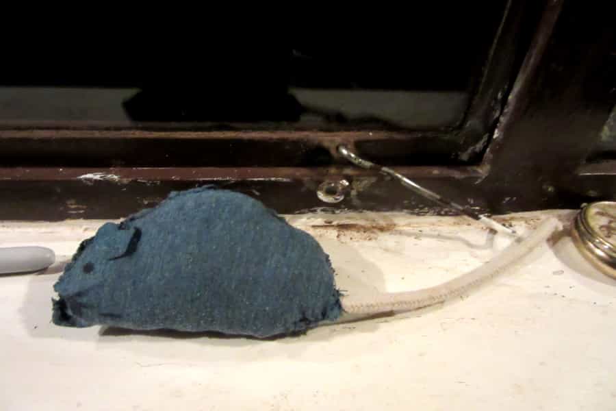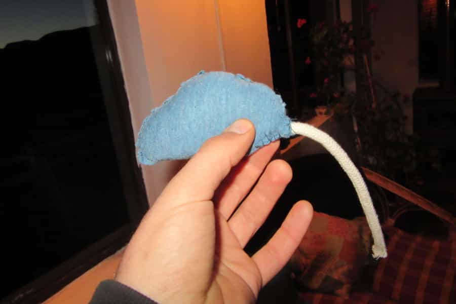 Aprovecha de introducir la cola (trozo de cuerda) y coserla a la base de tu “ratón”. Termina de cerrar la tela. Si tienes “hierba de gato” o algún aromatizante que les atraiga lo puedes aprovechar de introducir.