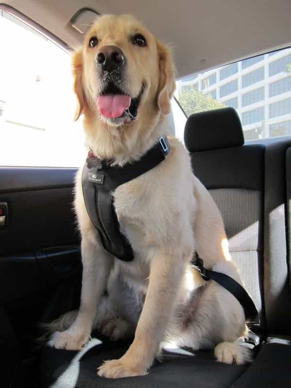 Cinturón de seguridad: esto es lo primero, tu perro debe levar arnés en el auto, este arnés especial es fácil de encontrar, yo lo compré en el Jumbo por unos $5.000. Tu perro irá seguro y en caso de accidente no saldrá despedido como proyectil. El arnés se ajusta de la misma forma y en el mismo lugar que el cinturón de seguridad trasero.