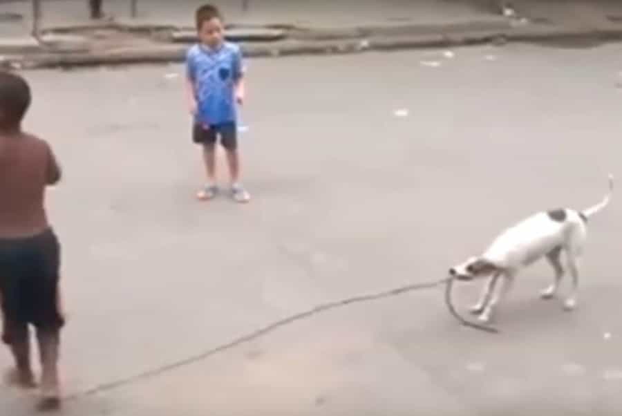 En lo que parece ser una favela brasileña, unos niños juegan a saltar la cuerda. pero hay un integrante del grupo que se ve bastante diferente al resto de la pandilla: se trata de un cuadrúpedo peludo, un perrito, que toma uno de los extremos de la cuerda con el hocico, para ayudar a que su amigo salte. El perrito está totalmente integrado al resto del grupo y goza como uno más. Vean este tierno video de niños y perros jugando, como jugábamos nosotros cuando eramos pequeños: