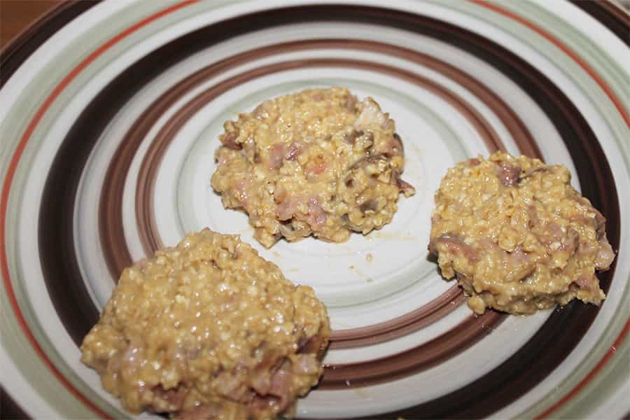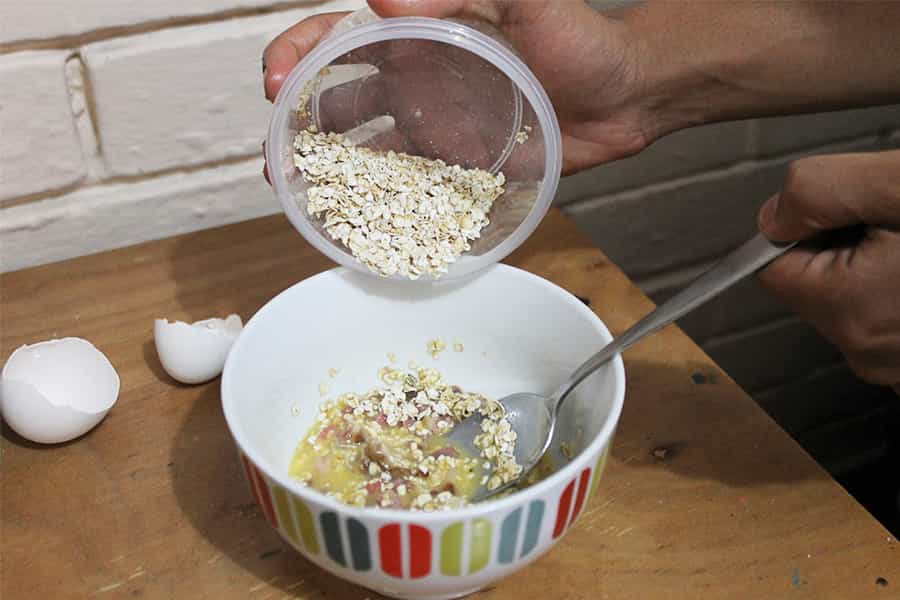 Luego de que hayas revuelto la mezcla de huevo y carne picada (o productos alternativos), debes agregar lentamente la avena. Continua revolviendo hasta que toda la avena esté mojada por el huevo.