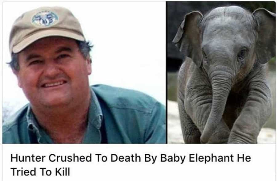 Ian Gibson, cazador estadounidense de 55 años, murió aplastado por un elefantito en Zimbabue mientras trataba de medir sus colmillos, debido a que andaba en búsqueda de marfil que un cliente le había encargado.