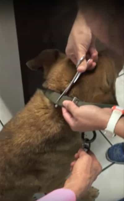 "Estuve visitándolo durante dos semanas, en las cuales me encariñé con él , y creo que él conmigo". En una de aquellas visitas, y mientras Jared ya tenía claro que no podía dejarlo ahí, aparece la dueña: "Le expliqué que el perrito necesitaba atención médica, y que tenerlo siempre amarrado era maltrato animal. Se rió de mí y me dijo que Rusty ya llevaba amarrado como 10 o 15 años" Entonces, Jared tomó la decisión "¡NO me iré de aquí sin el perro!" Ante lo cual la dueña finalmente cedió. Para llevárselo, utilizó la misma cadena en la que estuvo amarrado tanto tiempo, pero serviría mientras tanto. Rusty disfrutó cada segundo del paseo, y se portó muy bien en el veterinario. Fue ahí donde se deshicieron del terrible collar que tantos años le quitó su libertad, y donde recibió un buen baño, pues estaba muy cochinito.