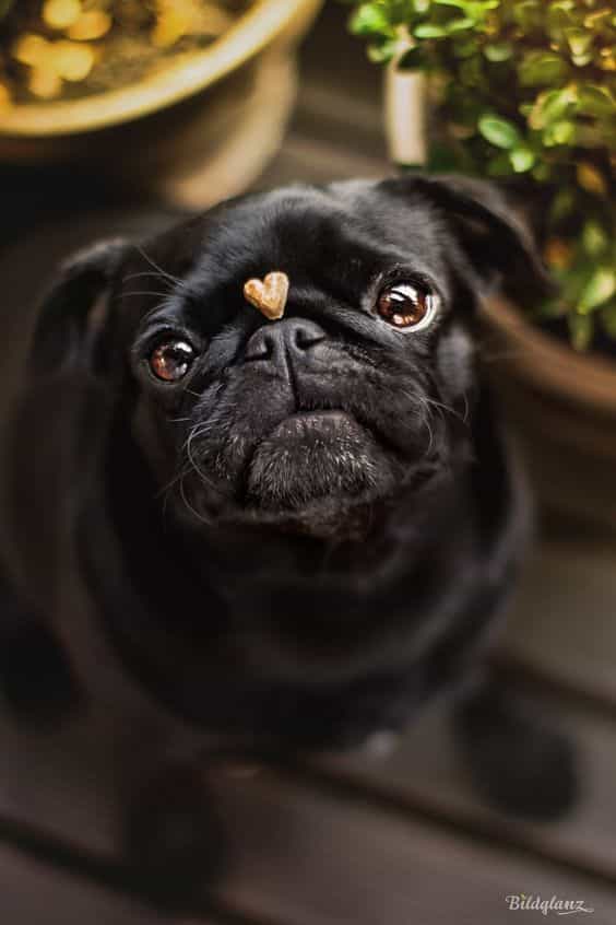 Y este precioso pug negro espera paciente la orden para poder devorarse esa golosina con forma de corazón.