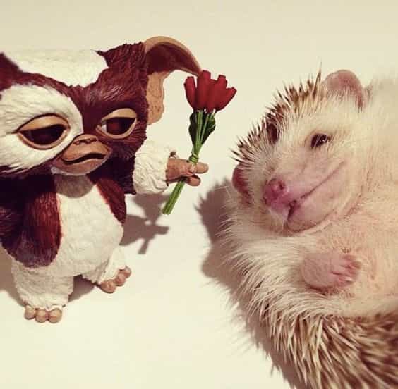 ¿Se acuerdan de los Gremlins? EN la foto una figurita de Gizmo le entrega una flor a esta tierna eriza, que lo observa encantada.