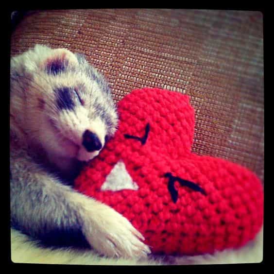 Este tierno hurón dormido abraza su corazón tejido a crochet. Una monada.