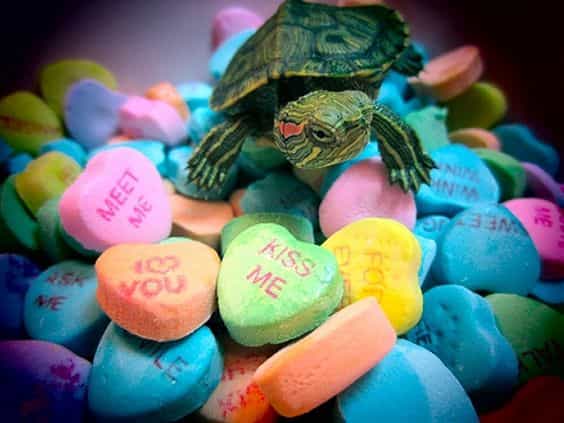 Y esta tortuguita recibió de regalo un montón de corazoncitos que parecen dulces, ¡pero no lo son! porque ella no puede comer eso.