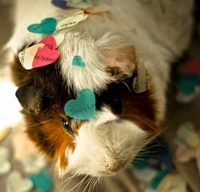 Un hermoso cuy cubierto de pequeños corazoncitos de papel.