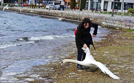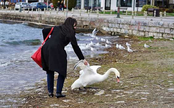 La ignorancia e indolencia de algunas personas realmente no tiene límites. Y todo por obtener una foto llamativa para alardear en las redes sociales. Ya nos indignamos hace muy pocos días con la muerte de un delfín en una playa argentina a manos de curiosos e irresponsables turistas, no pasó una semana y supimos del surfista californiano que sacó a un tiburón del agua para sacarse una selfie, y ahora, otra noticia de maltrato animal a manos de turistas en busca de la foto perfecta nos remece. Esta vez, es una mujer búlgara la protagonista, quien a costa de sacarse una "selfie" memorable en la orilla del lago Ohrid en Macedonia (Península de los Balcanes, Europa) agarra a uno de los incautos cisnes que se encontraban allí para fotografiarse con él. Es tanto lo que el ave luchó para zafarse que terminó muerto, porque ella no quiso soltarlo hasta lograr su cometido. En las imágenes se aprecia como ella lo tenía agarrado con firmeza de un ala, y quienes fueron testigos de la penosa escena dicen que la mujer "desechó" al cisne cuando logró su dichosa foto, dejándolo agónico para terminar muriendo a los pocos minutos.