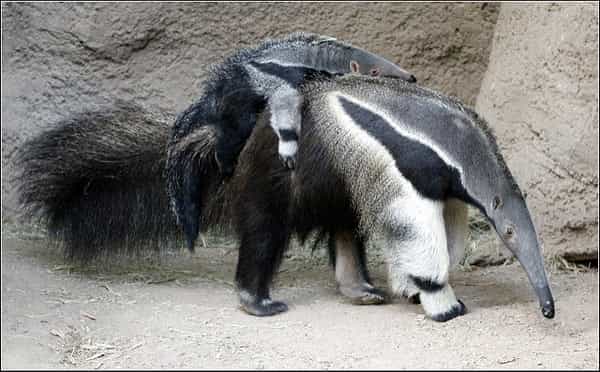 Los osos hormigueros gigantes tienen solo una cría cada 1 o 2 años y las cargan sobre su espalda, ya que sus pelajes se mimetizan y es menos probable que sean detectadas por los depredadores.