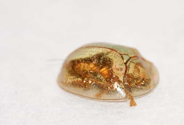 Este escarabajo sí que es raro. Su nombre científico es Charidotella Sexpunctata. Una de sus principales características es su peculiar caparazón. Primero, porque es muy parecido al de una tortuga terrestre y de ahí viene su nombre, también porque tiene un color dorado metálico y pareciese que estuviese bañado en oro. Este caparazón también tiene la facultad de cambiar de color a uno más rojizo, dependiendo de la humedad del entorno, y también es un sistema muy efectivo de defensa, ya que puede camuflarse fácilmente. Varios de estos insectos también tienen manchas negras en su parte inferior o vientre, lo que lo hace aun más llamativo. También el camuflaje con el color negro es mucho más efectivo, sobre todo en la noche.