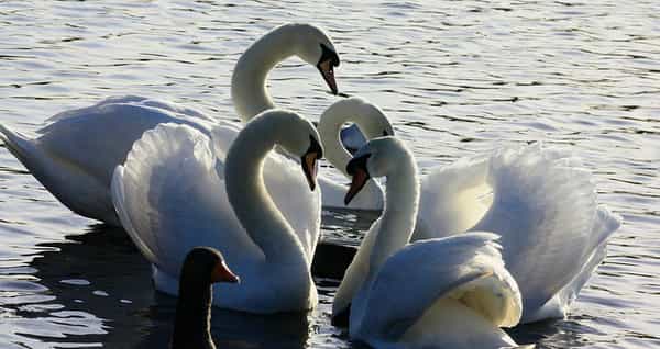 8. Cisne. Al igual que los guacamayos, el cisne solamente estará con una misma pareja siempre, solo cambiará en caso de que ésta muera o desaparezca y no siempre ocurre; en muchas ocasiones permanecen el resto de su vida solos. Además son muy cariñosos, en cuanto tienen pareja, no dejan nunca de besarla en el pico formando una figura muy parecida a un corazón. La manera de seducirlas es sumergiéndose en el agua y realizando movimientos con sus cuellos. Son muy fieles al territorio donde crían a sus hijos, pudiendo llegar a ser agresivos con otros cisnes que se acerquen o incluso con el ser humano.